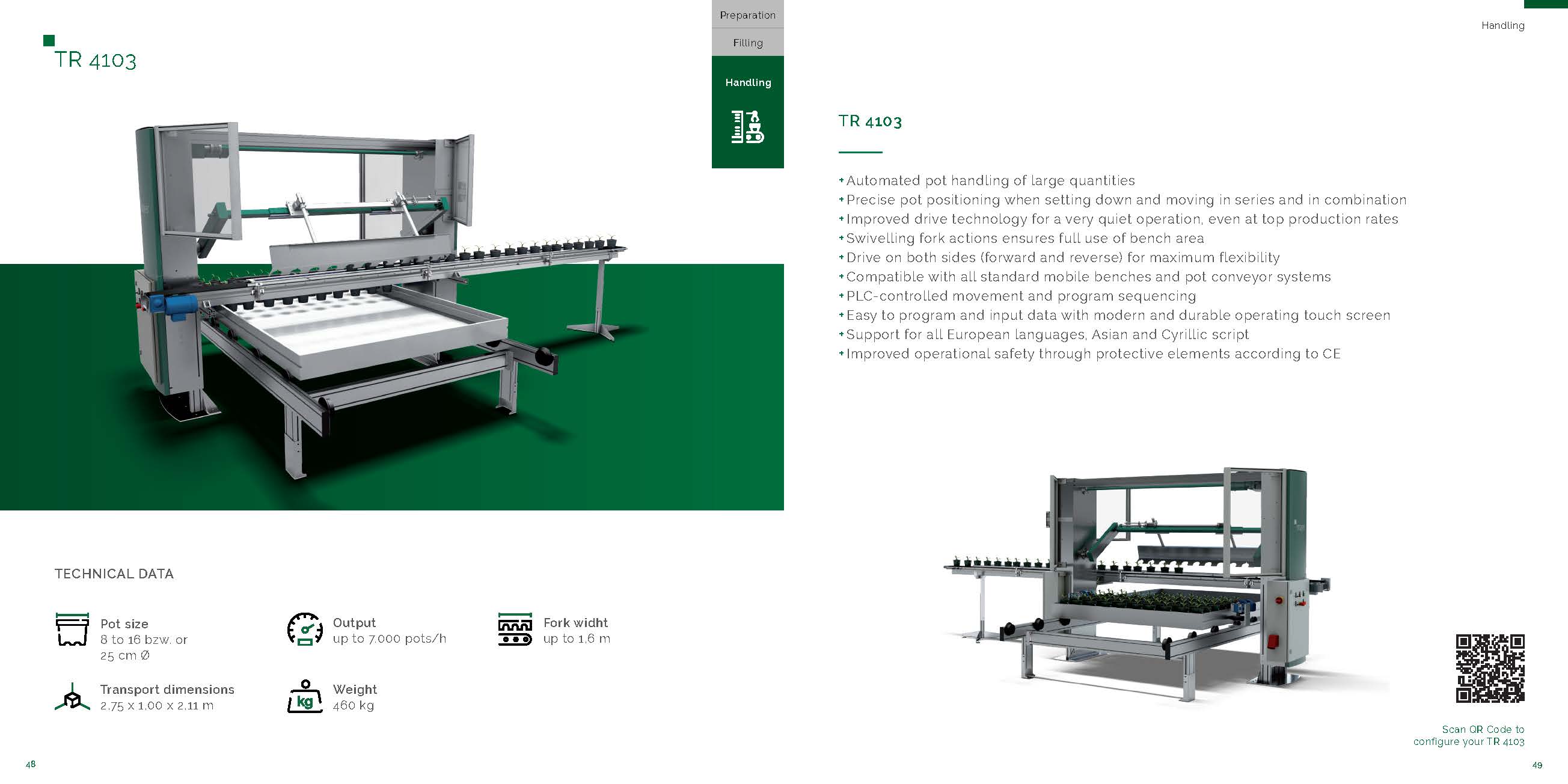 合理性和準(zhǔn)確性在這里同時(shí)得到保證:TR 4103通過優(yōu)化的運(yùn)動(dòng)順序(PLC控制)的平穩(wěn)運(yùn)行,在花盆放下并轉(zhuǎn)移到移動(dòng)工作臺(tái),拖車或傳送帶時(shí),展現(xiàn)了其精確組織的工作力。作為自動(dòng)的“分配中心”,它顯著提高了加工潛力,與強(qiáng)大的上盆機(jī)的工作量完全匹配。